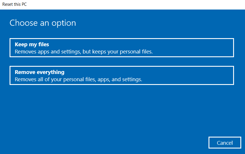 - Select “Keep my files” if you wish to keep your files. If you’re going to remove everything we recommend you back up your hard drive.