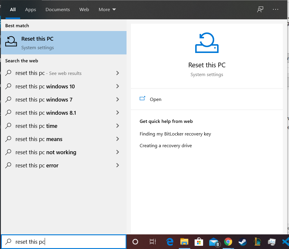 - Search for “Reset this PC” in your Star menu bar and click to open.