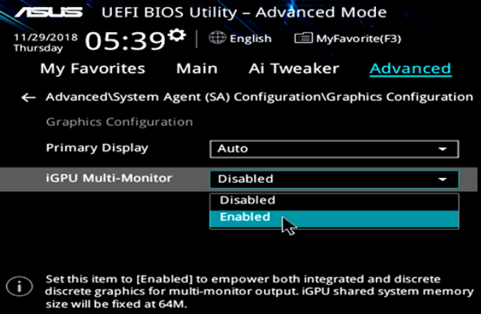 However, if you have a discrete graphics card, you’ll need to enter your BIOS and enable Intel Graphics for this to work. First, reboot your computer and repeatedly press F2, F8, or F12 to enter the BIOS. Your Intel Graphics settings are usually found under the Advanced BIOS settings called IGD Multi-Monitor, iGPU Multi-Monitor, Intel Integrated GPU, or Intel Processor Graphics(the name may vary based on your computer manufacturer). Change the status to Enabled, then save and reboot your computer.