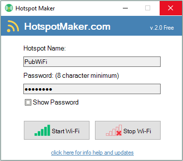 Hotspot Maker is a 100% free software that allows you to create a hotspot easily in your homes and small offices. It contains no adware and spyware and is compatible with all versions of Windows. Additionally, there’s a portable version available that lets you carry the application around on a USB. The user interface has all the basic settings you need such as setting the hotspot name, password, and buttons to start and stop the network.