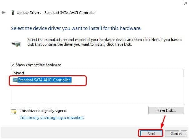 Step 7 – Choose ‘SATA AHCI Standard Controller’ and click the Next button to complete your procedure.