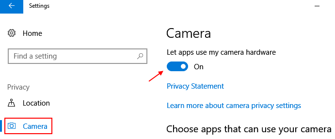 - Now, the right side, make sure that the “let the app use my camera hardware” has been set to ON, if not then click on it to enable the application to use the camera.