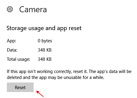 - A new window will appear, now click on the Reset button to reset the Camera application.