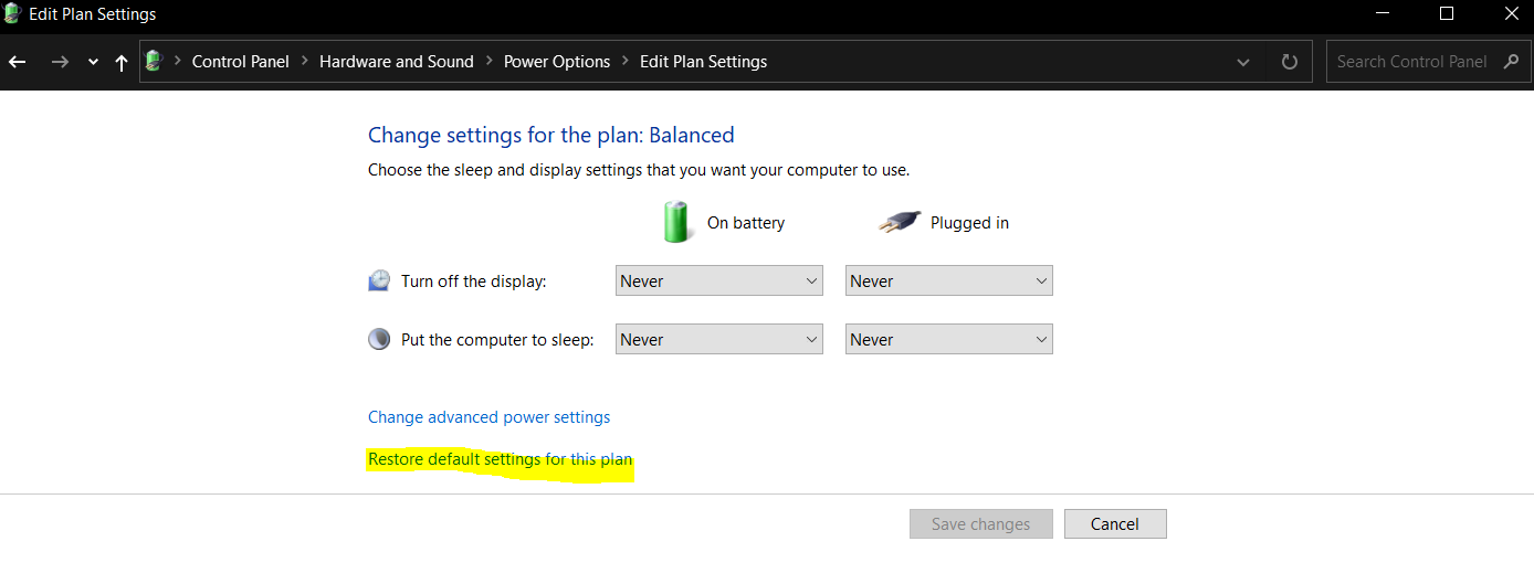 - Now select “Restore default settings for this plan” and select Yes when it asks you to confirm.