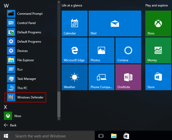 - From the Start Menu’s list of applications, click on Windows Defender.