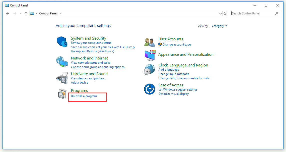 - Select on “Uninstall a Program” under the program section