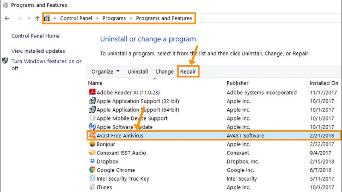 - Locate Avast in Control Panel and select Uninstall/Repair