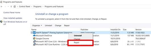 You can resolve the error by repairing the Intel Optane Explorer Extension. Follow the steps mentioned below to repair it-