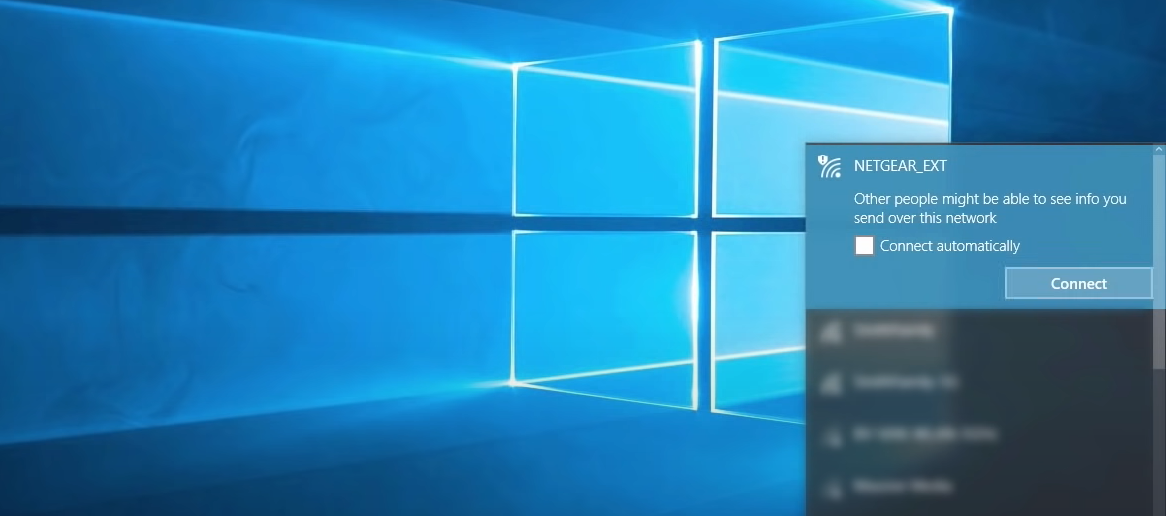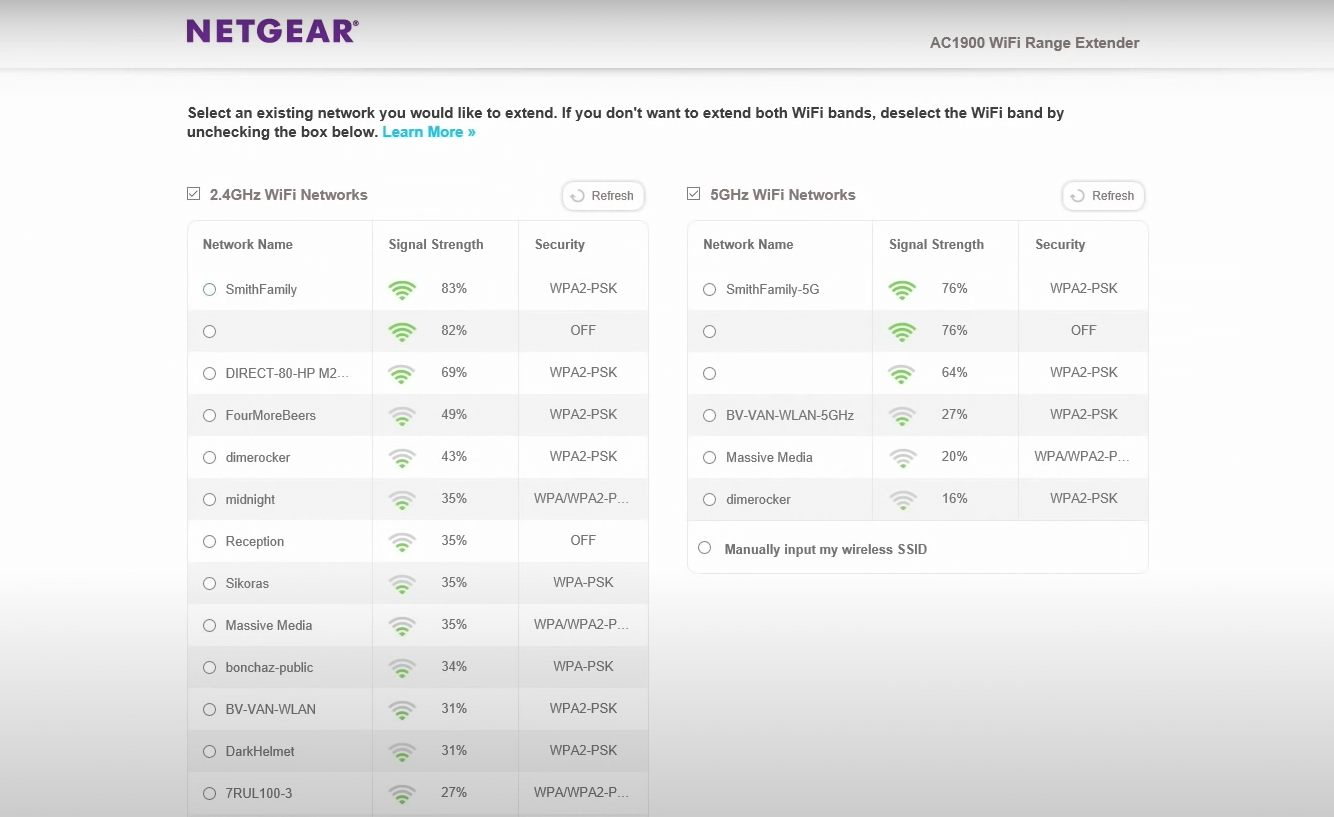 - When you’ve secured a position for your Netgear extender, connect your device to the Netgear extender network. The network name uses your standard network name with either “_2GEXT” or “_5GEXT” added on the end. Use the same Wi-Fi password you’d use for your router.