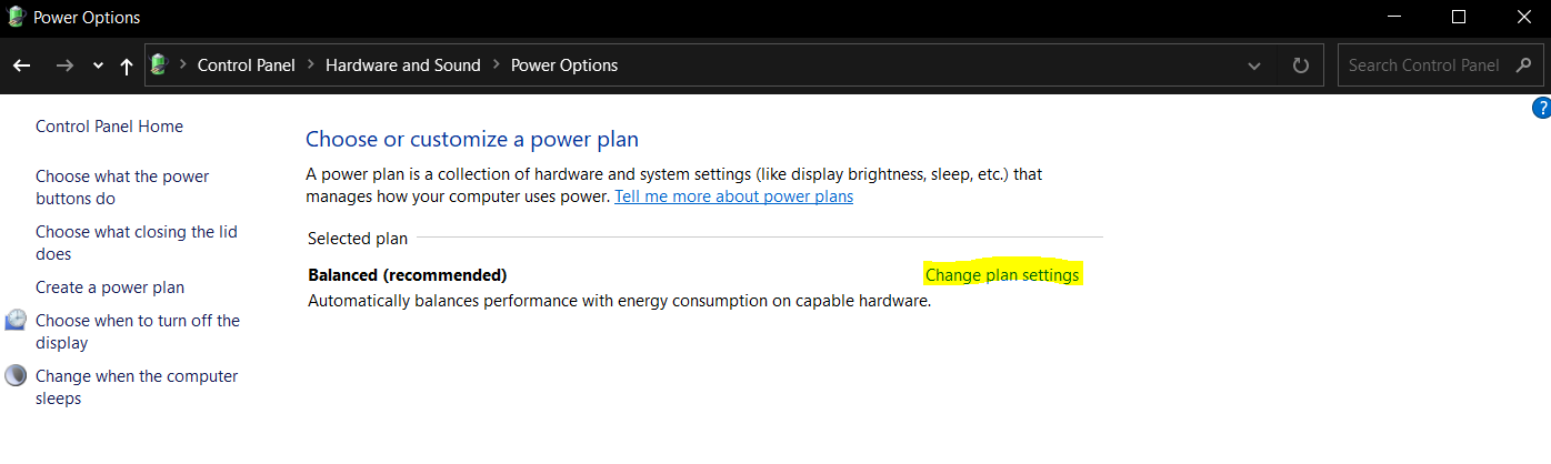- In your currently selected power plan, click on the “Change plan settings” option.