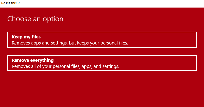 - Select “Keep my files”. This will remove any installed software and apps but all of your important files, documents, images, etc. will remain untouched.